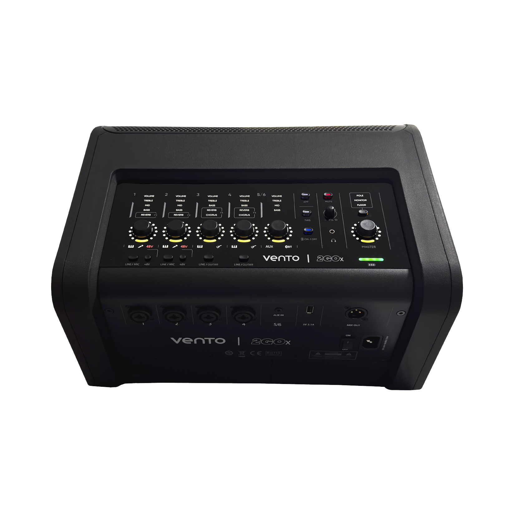 Los canales 1 y 2 incluyen alimentación Phantom Power de 48V para micrófonos de condensador y cuentan con efecto de reverb dedicado.